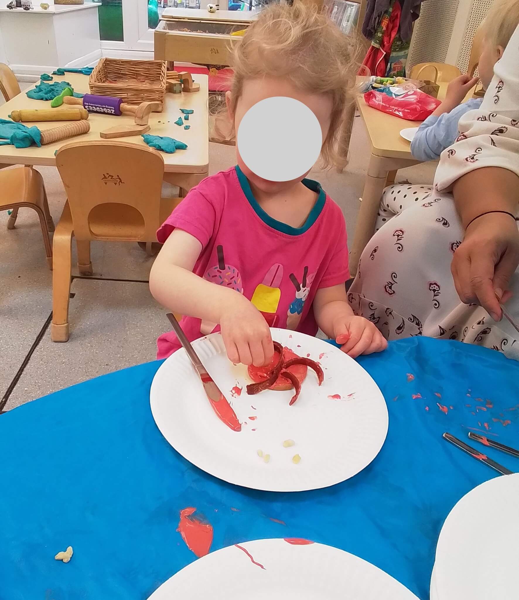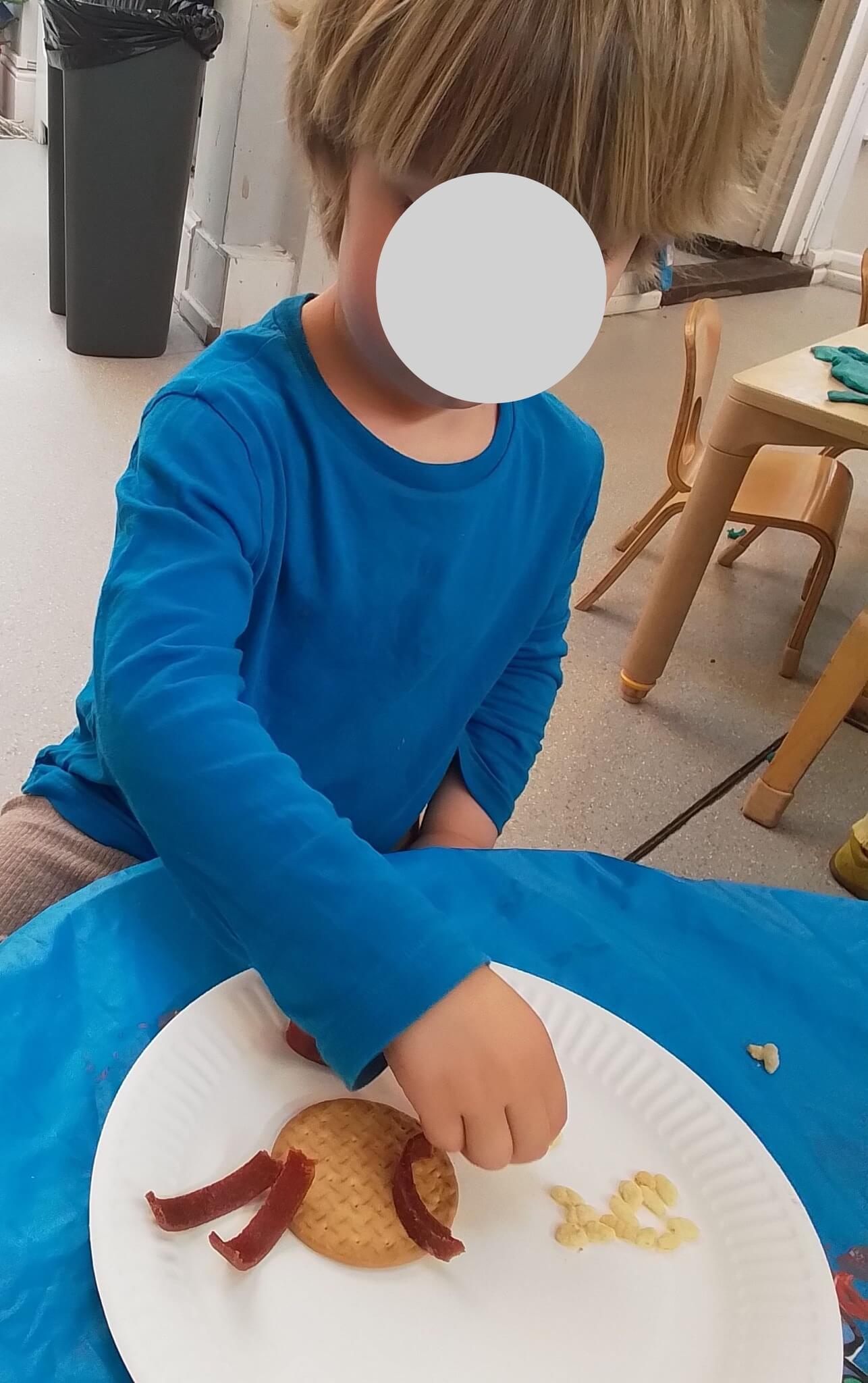 Children did well using their physical skills to spread the icing and pull the length of the fruit stick. Lots of language displayed during this activity as children engaged in conversations with both peers and adults alike based on mathematical context (counting the legs/length) as well as developing vocabulary and their knowledge/understanding of sea life all around us.