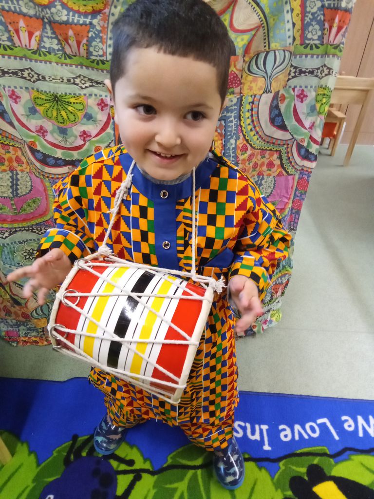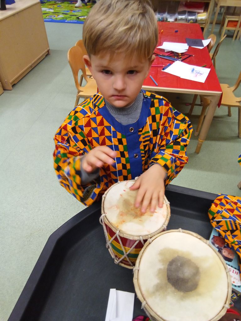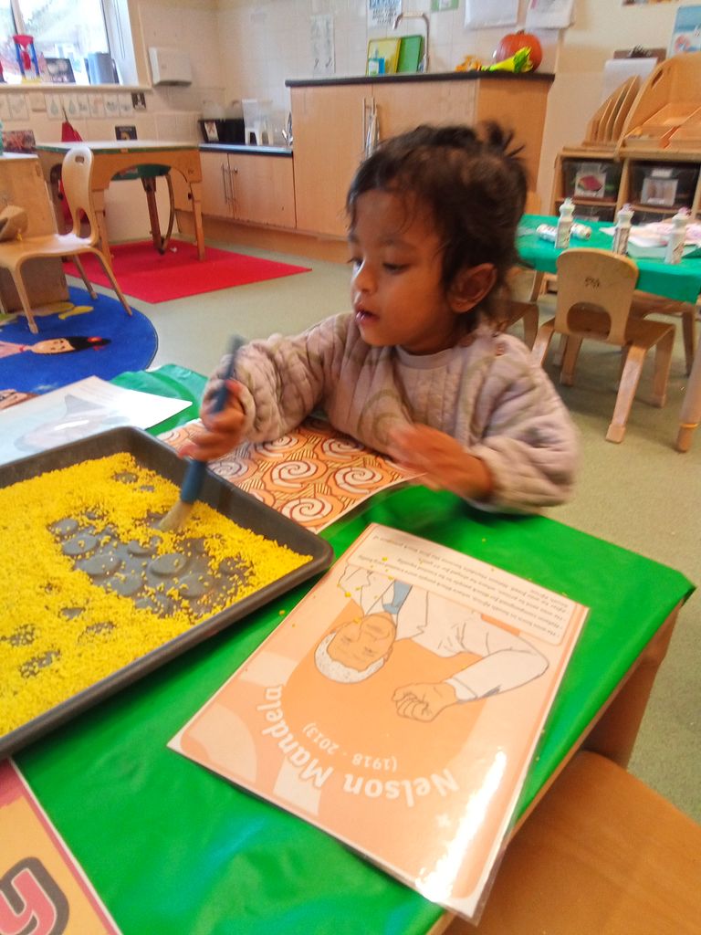 For Diwali, they explored the festival’s traditions and created colourful firework art, building independence and gross motor skills. During Black History Month, they listened to stories about inspiring figures, dressed up to honour cultural heritage, and recreated African patterns using mark-making tools and rice—enhancing fine motor skills and cultural awareness.
